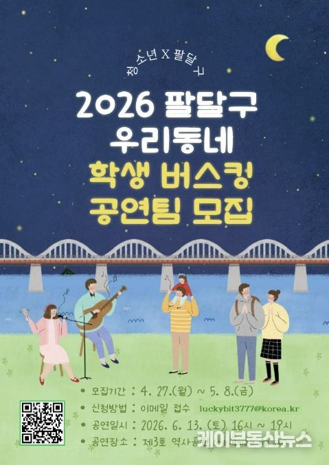 케이부동산뉴스 김교민 기자 | 수원시 팔달구가 청소년들이 직접 주인공이 되어 공연에 참여하고 즐기는 ‘2026 팔달구 우리동네 학생 버스킹’의 공연팀을 모집한다고 밝혔다.