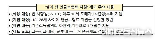 아울러 첫 보험료 지원으로 국민연금 가입자가 된 후에는 두루누리 보험료 지원, 저소득 지역가입자 보험료 지원, 실업크레딧 등 다양한 지원 제도의 혜택을 받을 수 있다.