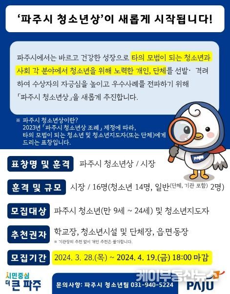 시는 2023년 제정된 '파주시 청소년상 조례'에 따라, 바르고 건강한 성장으로 타의 모범이 되는 청소년과 사회 각 분야에서 청소년을 위해 노력한 개인·단체를 선발해 ‘파주시 청소년상’을 수여할 계획이다.