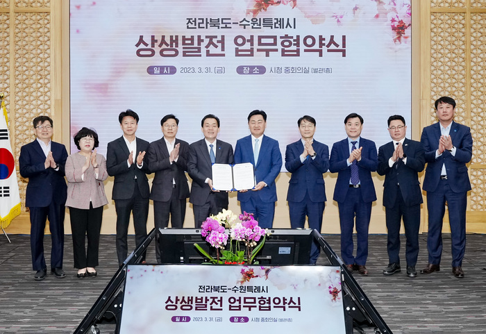 수원시는 전라북도와 3월 31일 시청 중회의실에서 ‘수원-전북 관계인구 형성을 위한 상생 발전 업무협약’을 체결했다. 협약식에는 이재준 수원특례시장과 김관영 전북도지사 등이 참석했다.