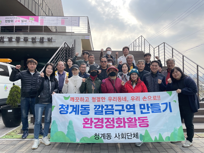 청계동은 지난해부터 통장협의회, 주민자치위원회 등 9개의 사회단체가 자발적으로 참여하는 마을환경 정화사업을 추진 중으로, 매주 각 단체가 돌아가며 쓰레기 줍기, 잡초 제거, 안전위험요소 발굴 등 청결한 마을 가꾸기에 힘을 보태고 있다.