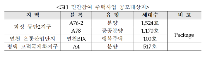 경기주택도시공사(GH)가 주택사업을 공동추진할 민간사업자를 공모한다고 27일 밝혔다. 공모대상지는 화성 동탄2지구 A76블록 등 4개 블록이다.