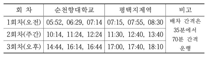 시는 지난해 8월부터 충남도와 함께 연계하여 추진한 사업으로 순천향대를 기점으로 아산터미널~배방역~천안시청~한기대~공주대~대흥리~안궁리~평택지제역(SRT이용)~평택터미널까지 왕복 운행하는 광역 버스 노선으로, 이용요금은 일반 2,000원, 어린이1,000원, 청소년 1,600원이며, 3대 버스로 1일 총 운행 횟수는 18회다.