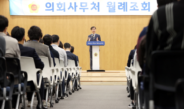 염 의장은 또 직장 내 선후배 간 소통과 상호존중을 강조하며 “선배에 대한 배려와 후배를 향한 사랑이 더욱 피어나는 의회가 되길 바란다”라며 “각자의 영역과 위치에서 개개인을 존중하는 조직문화를 만들기 위해 의장으로서 최선을 다하겠다. 직원들도 모두 노력해달라”라고 당부했다.