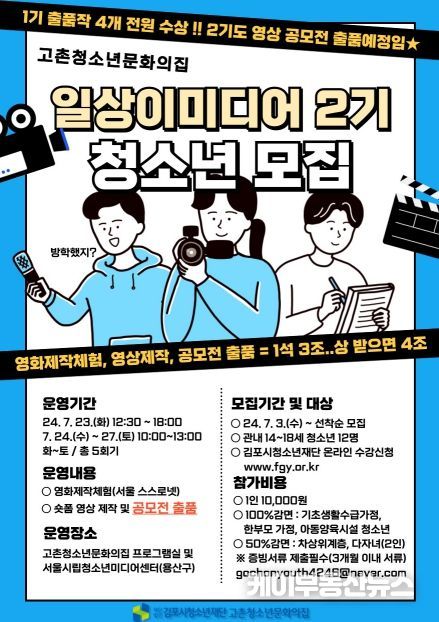 ‘일상이 미디어 2기’는 7월 3일 오전 10시부터 김포시청소년재단 홈페이지 온라인통합접수시스템에서 신청 가능하다.