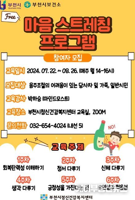 케이부동산뉴스 김교민 기자 | 부천시와 부천시정신건강복지센터는 중독 대상자들의 심리적 유연성과 적응성을 훈련해 일상생활 능력을 키울 수 있는 알코올 교육 ‘마음 스트레칭 프로그램’을 운영한다.