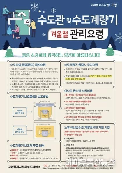 이동환 고양시장은 “스마트 검침 시스템 모니터링을 강화해 정밀한 수도요금 정보체계를 구축하고 누수 불편을 해소하는 등 상수도 관리 효율성을 높일 계획”이라며 “수도계량기 동파방지에 대비한 24시간 상황실 가동으로 겨울철에도 안정적인 물 공급에 최선을 다하겠다”고 말했다.
