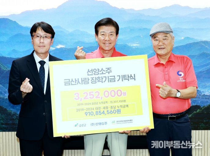 케이부동산뉴스 김교민 기자 | ㈜선양소주(대표 김규식)는 지난 1일 지역 인재 육성을 위해 금산군 장학금 325만2000원을 (재)금산교육사랑장학재단에 기탁했다