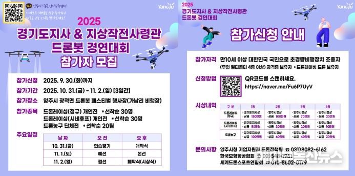 케이부동산뉴스 김교민 기자 | 양주시가 '2025 경기도지사ㆍ지상작전사령관배 드론봇 경연대회'에 참가할 일반부 선수를 오는 9월 30일까지 모집한다.