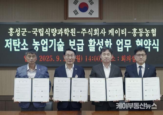 케이부동산뉴스 김교민 기자 | 홍성군은 29일, 국립식량과학원, KT(케이티), 홍동농협과 함께 저탄소 농업기술 보급 활성화를 위한 4자간 업무협약(MOU)을 체결했다고 밝혔다.