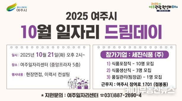 케이부동산뉴스 김교민 기자 | 여주시는 오는 10월 21일 오후 2시 여주일자리센터(세종로 14번길 18, 중앙프라자 5층)에서 ‘2025년 10월 일자리드림데이’를 연다.