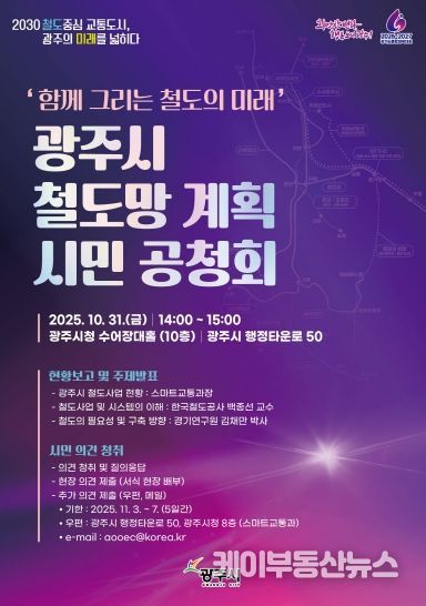 케이부동산뉴스 김교민 기자 | 광주시는 오는 31일 오후 2시, 광주시청 수어장대홀(10층)에서 ‘함께 그리는 철도의 미래’를 주제로 광주시 철도망 계획 시민 공청회를 개최한다.