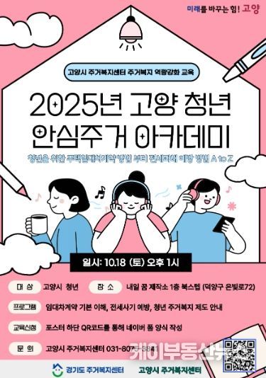 케이부동산뉴스 김교민 기자 | 고양특례시는 청년층의 안정적인 주거생활을 지원하기 위해 오는 10월 18일 13시 내일꿈제작소(덕양구 은빛로 72)에서 ‘2025 고양청년 안심주거 아카데미’를 개최한다고 밝혔다.