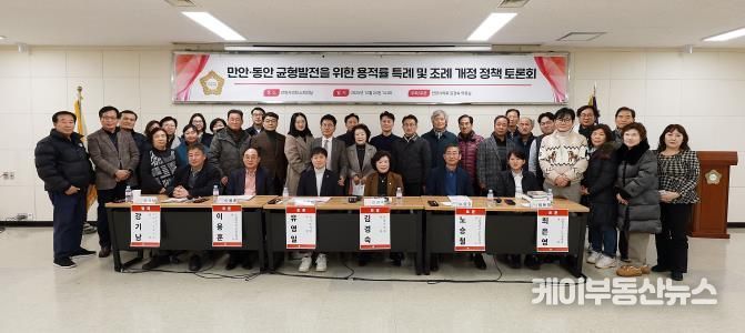 케이부동산뉴스 김교민 기자 | 안양시의회 김경숙 의원(국민의힘, 석수1·2동·충훈동)은 12월 24일 시의회 소회의실에서 '만안·동안 균형발전을 위한 용적률 특례 및 조례 개정 정책토론회'를 개최하고, 만안과 동안 간 개발 격차 해소를 위한 다양한 정책 대안을 논의했다.