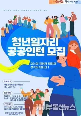 케이부동산뉴스 김교민 기자 | 이천시는 2026년 1월 5일부터 1월 16일까지 ‘청년일자리 공공인턴사업’의 상반기 참여자 47명을 모집한다.