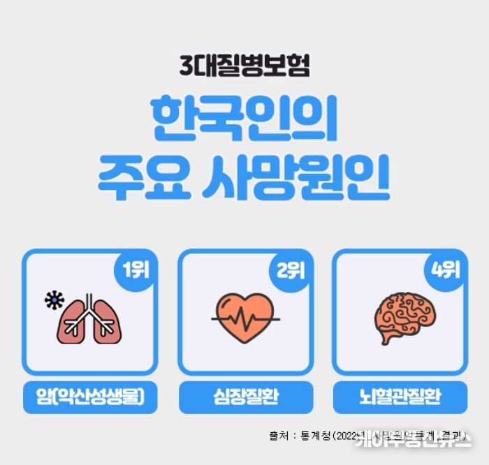 케이부동산뉴스 김교민 기자 | 3대질병으로 일컬어지는 암, 뇌혈관질환, 심혈관질환은 한국인의 주요 사망원인에서 상위를 차지하고 있으며, 이에 대한 진단비를 집중적으로 보장해 주는 보험상품을 3대질병진단비 보험이라 할 수 있다.