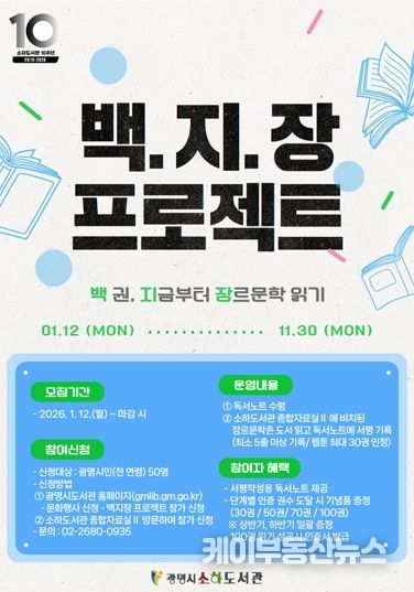 케이부동산뉴스 김교민 기자 | 광명시 소하도서관은 오는 12일부터 장르문학 도서 100권 읽기 챌린지인 ‘백.지.장 프로젝트’ 참여자를 모집한다.