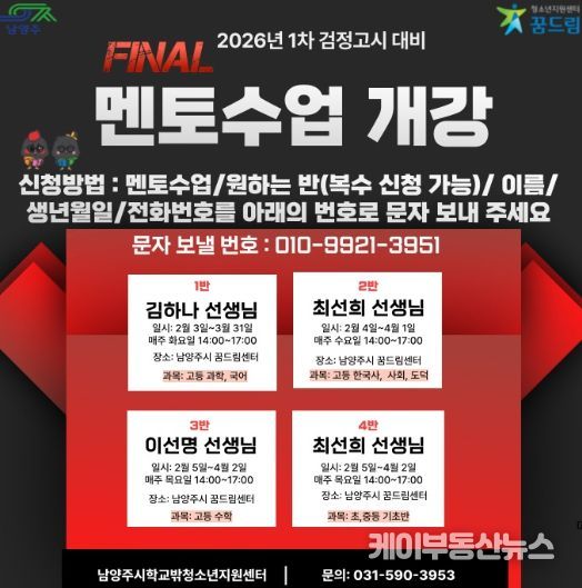 케이부동산뉴스 김교민 기자 | 남양주시는 오는 2월 3일부터 남양주시학교밖청소년지원센터에서 학업을 중단한 청소년을 대상으로 ‘2026년도 제1회 검정고시 대비 학습 멘토링 프로그램’을 운영한다고 밝혔다.
