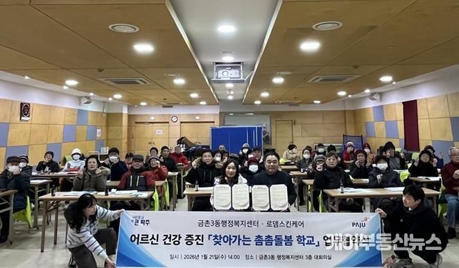 케이부동산뉴스 김교민 기자 | 파주시 금촌3동은 지난 21일 3층 대회의실에서 관내 로뎀스킨케어와 지역 어르신들의 건강 증진을 위한 사회 공헌 업무 협약을 체결했다.