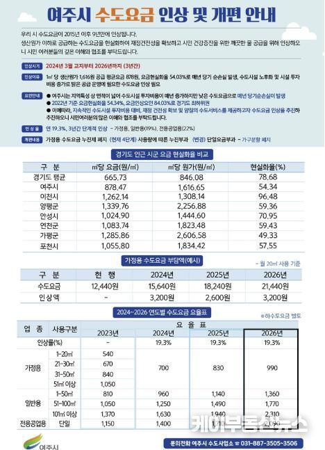 케이부동산뉴스 김교민 기자 | 여주시 수도사업소는 지난 2024년부터 추진해 온 ‘수도요금 현실화 3개년 계획’에 따라, 오는 2026년 3월 고지분부터 마무리 단계인 19.3% 인상을 시행한다고 밝혔다. 이번 인상은 만성적인 적자 구조를 탈피하고 시민들에게 보다 안전하고 깨끗한 수돗물을 공급하기 위한 조치다.