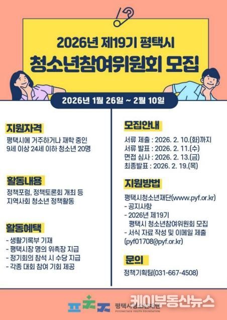 케이부동산뉴스 김교민 기자 | 평택시와 평택시청소년재단은 청소년 정책 참여 기회를 확대하고 자치 역량을 강화하기 위한 2026년 제19기 청소년참여위원회 위원 20명을 공개 모집한다고 밝혔다.