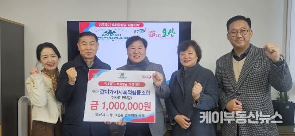 케이부동산뉴스 김교민 기자 | 오산시는 지난 30일, 같이가치사회적협동조합으로부터 관내 아동공동생활가정(그룹홈)인 ‘광야의집’ 입소 아동을 위한 후원성금 100만 원을 기탁받고 기탁식을 가졌다고 밝혔다.