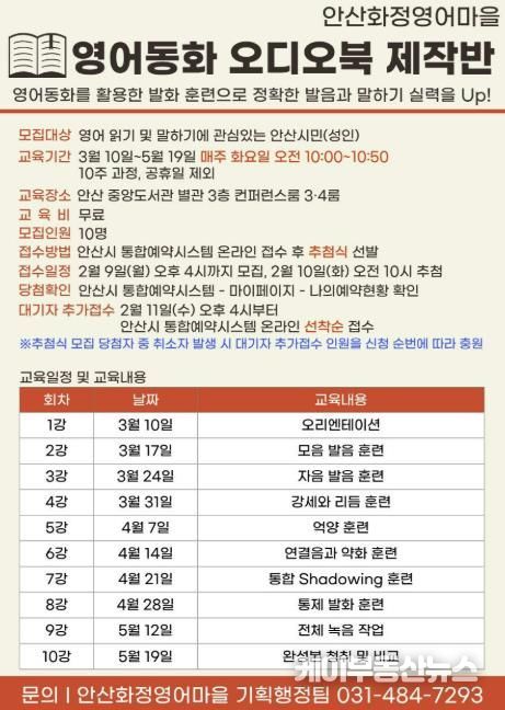 케이부동산뉴스 김교민 기자 | 안산시가 설립하고 안산대학교가 운영하는 안산화정영어마을이 성인 영어 학습자를 위한 ‘영어동화 오디오북 제작반’을 3월부터 5월까지 10주 과정으로 안산시 중앙도서관에서 운영한다고 4일 밝혔다.