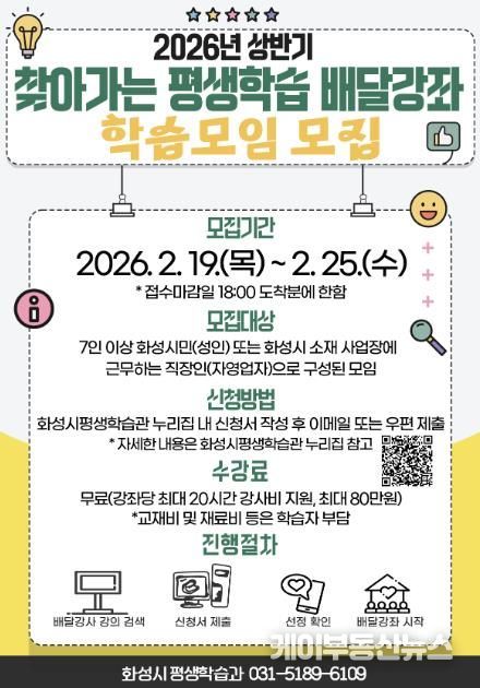 케이부동산뉴스 김교민 기자 | 화성특례시는 2월 19일부터 2월 25일까지 2026년 상반기'찾아가는 평생학습 배달강좌'학습모임을 모집한다.