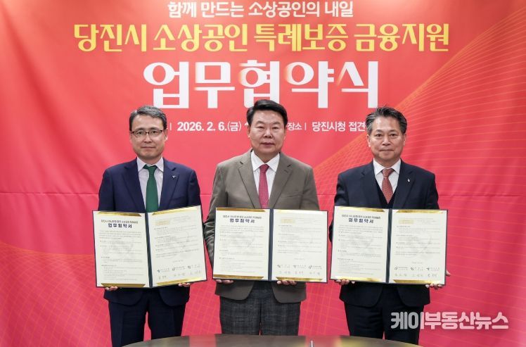 케이부동산뉴스 김교민 기자 | 당진시는 6일 당진시청 접견실에서 오성환 당진시장과 함종덕 하나은행 충남북영업본부 지역대표, 조소행 충남신용보증재단 이사장이 참석한 가운데 소상공인 특례보증 금융지원을 위한 업무협약을 체결했다고 밝혔다.