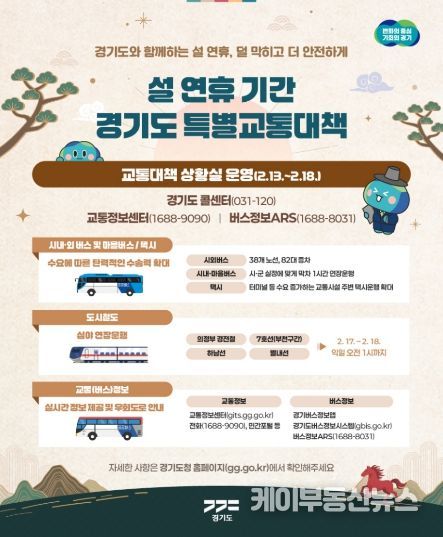 케이부동산뉴스 김교민 기자 | 경기도가 안전하고 편한 설 귀성길 조성을 위해 13일부터 18일까지 6일간을 ‘2026년도 설 연휴 특별교통대책기간’으로 정하고 시외버스 증차, 도로정보 실시간 안내, 긴급도로 복구 체계 구축 등 적극 대응한다.