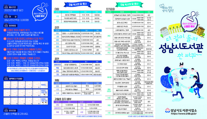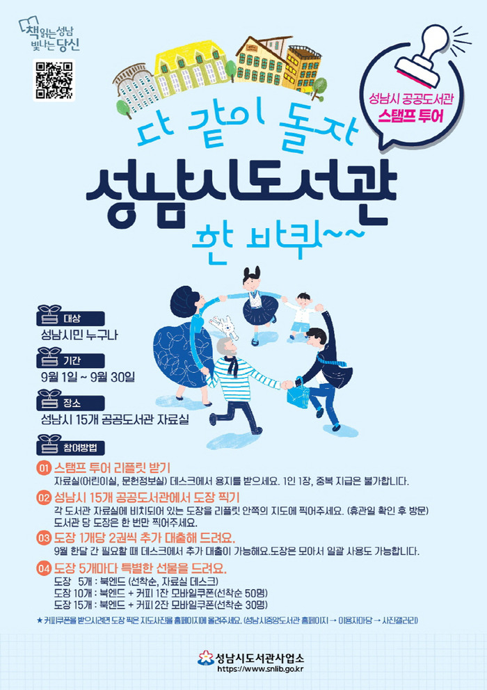 성남시는 독서의 달을 맞아 오는 9월 1일부터 30일까지 ‘다 같이 돌자 성남시도서관 한 바퀴’ 스탬프 투어 프로그램을 운영한다.
