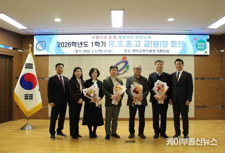 케이부동산뉴스 김교민 기자 | 충청남도태안교육지원청은 3월 5일 태안교육지원청 대회의실에서 관내 유‧초‧중‧고 교장(원장), 교육지원청 담당자 60명이 참석한 가운데 2026학년도 1학기 유‧초‧중‧고 교장(원장) 회의를 개최했다.
