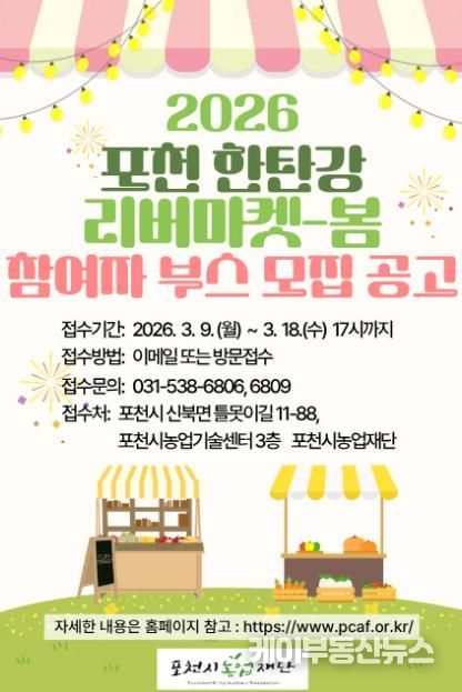 케이부동산뉴스 김교민 기자 | 포천시농업재단은 오는 5월 한탄강 생태경관단지에서 열리는 ‘2026년 포천 한탄강 리버마켓-봄’ 행사에 참여할 부스 운영자를 공개 모집한다.
