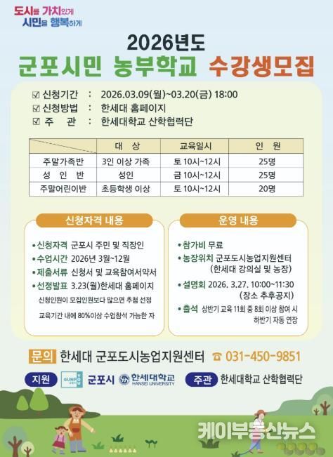 케이부동산뉴스 김교민 기자 | 군포시 도시농업 활성화 지원사업 보조사업자인 한세대학교가 오는 3월 20일까지 2026년도 군포시민 농부학교 신규 수강생을 모집한다고 밝혔다.