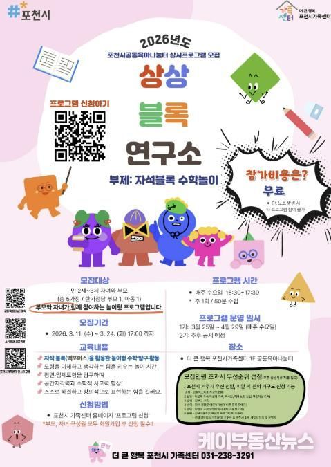 케이부동산뉴스 김교민 기자 | 포천시 직영 ‘더 큰 행복 포천시가족센터’는 공동육아나눔터 상시 프로그램의 일환으로 유아 대상 창의 놀이 프로그램 '상상블록연구소'를 시범 운영한다.