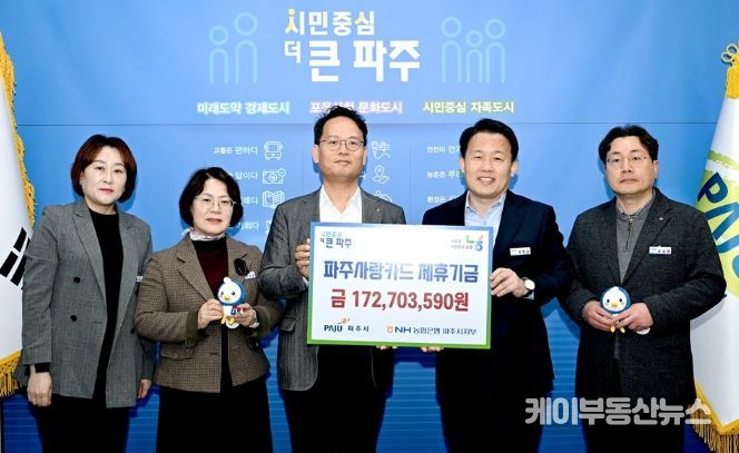 케이부동산뉴스 김교민 기자 | 파주시는 지난 18일 엔에이치(NH)농협은행 파주시지부로부터 지난해 적립된 제휴카드 적립기금 172,703,590원을 전달받았다.