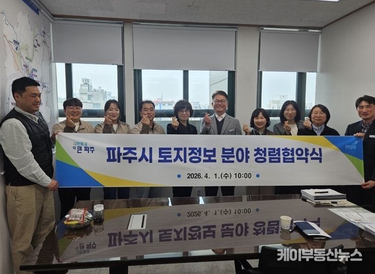 케이부동산뉴스 김교민 기자 | 파주시는 지난 1일 지적측량 수행기관인 한국국토정보공사 파주지사와 ‘토지정보 분야 청렴협의체’를 구성하는 내용으로 협약을 체결했다.