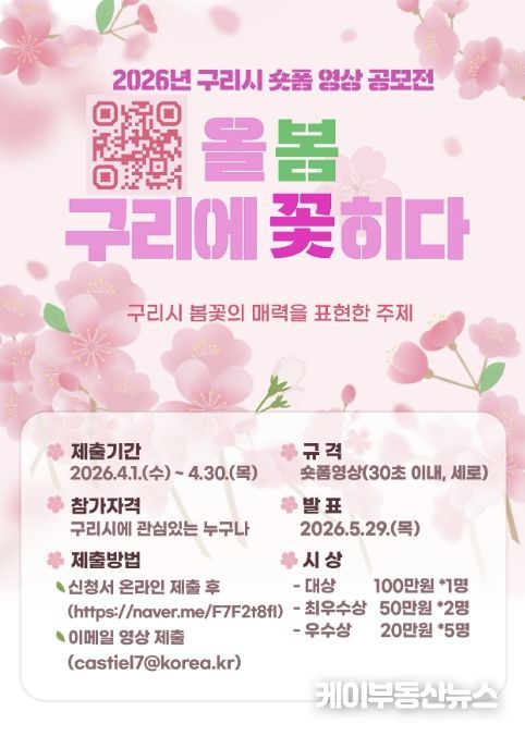 케이부동산뉴스 김교민 기자 | 구리시는 올해 새롭게 시작하는 봄꽃 축제 ‘장자호수 벚꽃마실 축제’를 효과적으로 홍보하고 시민과의 소통을 강화하기 위해 ‘2026 구리시 숏폼 영상 공모전 '올봄, 구리에 꽃히다'’ 접수를 4월 30일까지 진행한다고 밝혔다.