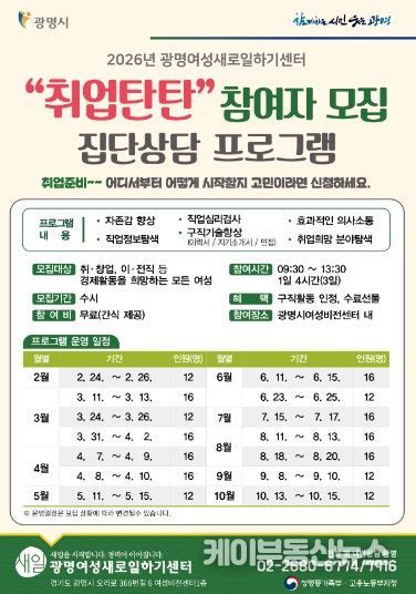 광명여성새로일하기센터는 취·창업과 이·전직을 희망하는 여성을 위해 ‘취업탄탄’ 집단상담 프로그램 참여자를 수시 모집하고 있다고 8일 밝혔다.