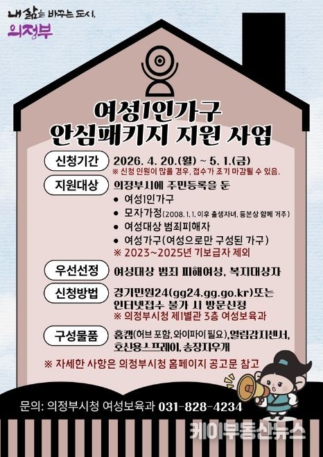 케이부동산뉴스 김교민 기자 | 의정부시는 4월 20일부터 5월 1일까지 12일간 온․오프라인을 통해 여성 1인 가구 안심패키지 지원사업의 신청을 접수한다.