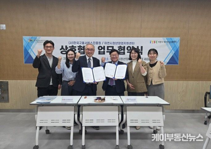 케이부동산뉴스 김교민 기자 | 이천시는 청년 취업 및 창업 지원 강화를 위해 사단법인 한국고용서비스진흥원과 이천시 청년창업지원센터가 지난 4월 15일 센터 세미나실에서 업무협약(MOU)을 체결했다고 밝혔다.