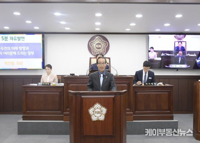 케이부동산뉴스 김교민 기자 | 동두천시의회 박인범 의원(더불어민주당, 나선거구)이 제345회 임시회 폐회식에서 시의원으로서의 마지막 5분 자유발언에 나섰다. 제1대, 제8대, 제9대 동두천시의원과 제8대 경기도의회 의원을 거친 박 의원은 이번 임기를 끝으로 의정활동을 마무리하며, 공직자들에게 '시민이 찾아오는 동두천'을 향한 당부의 메시지를 전했다.