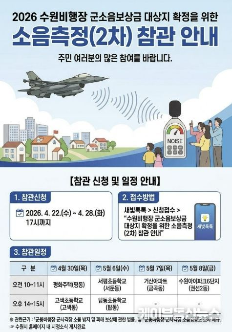 케이부동산뉴스 김교민 기자 | 수원특례시가 수원비행장 인근 주민들의 소음 피해 보상 근거가 될 국방부의 ‘수원비행장 소음 영향도 조사 2차 소음측정’ 주민 참관 참여자를 모집한다. 4월 28일까지 새빛톡톡으로 신청할 수 있다.