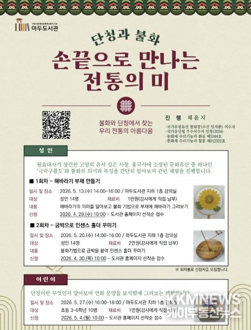 KKMNEWS 김교민 기자 | 고양특례시 마두도서관은 오는 5월, 단청과 불화를 주제로 우리 전통의 아름다움을 체험할 수 있는 프로그램 ‘손끝으로 만나는 전통의 미’를 운영한다.