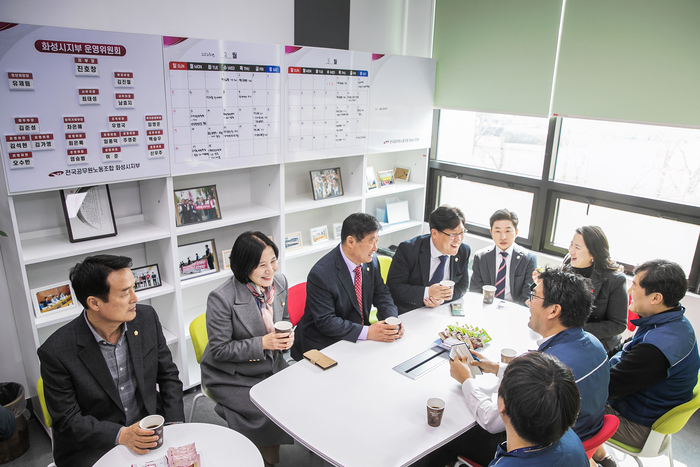 화성시의회 기획행정위원회(위원장 이은진)는 지난 28일 시청 내 전국공무원노동조합 화성시지부(지부장 진호창) 사무실을 방문해 지부 운영위원들을 격려하며 소통하는 시간을 가졌다.