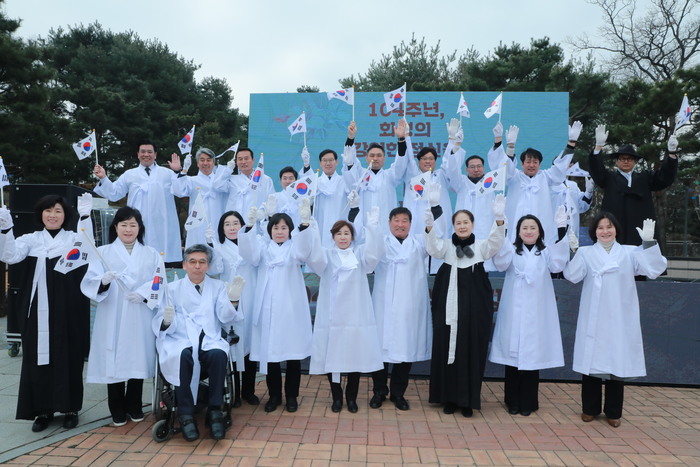 올해 3·1절 기념식은 ‘104주년 화성의 강인한 정신을 잇다’를 주제로 국민의례와 기념영상 상영, 독립선언서 낭독, 경축사, 헌정공연, 삼일절 노래 제창과 만세삼창 순으로 진행됐다.