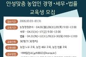 케이부동산뉴스 김교민 기자 | 안성시농업기술센터가 지역 농업인의 안정적인 영농 활동을 돕기 위해 오는 31일까지 ‘안성맞춤 농업인 경영·세무·법률 교육’ 교육생을 모집한다. 이번 교육은 전문가 특강을 통해 농가 운영 중 발생할 수 있는 경영적, 법적 문제를 사전에 예방하고 해결할 수 있는 역량을 키워주기 위해 마련됐다. 교육은 오는 4월 6일부터 30일까지 주제별 지정된 날짜에 진행된다. 모집 분야는 ▲농업 경영 ▲농업 세무 ▲농업 법률 등 3개 과정이며, 분야별로 30명씩 총 90명을 선발한다. 신청 인원이 초과할 경우 내부 선발 기준에 따라 교육생을 최종 선정할 예정이다. 신청 자격은 농업 경영에 관심 있는 안성시민이라면 누구나 가능하며, 접수는 3월 31일까지다. 참여를 희망하는 시민은 이메일을 보내거나 농업기술센터 농업지도과(보개원삼로 219)를 방문해 신청하면 된다. 시 관계자는 “농업인의 눈높이에 맞춘 경영·법률·세무 전문가 특강이 농가 역량을 강화하는 좋은 기회가 될 것”이라며, “안성 농업의 내실을 다지고 싶은 시민 여러분의 많은 관심과 참여를 바란다”고 말했다.